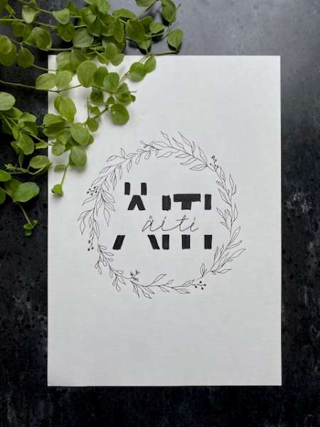 Saapu Design käsinpiirretty Äiti-kortti vaalealle kartongille.
