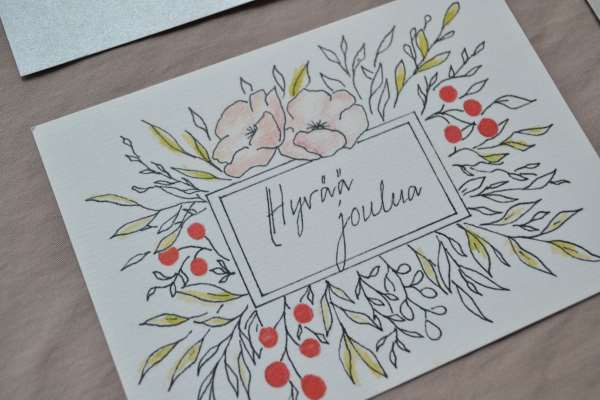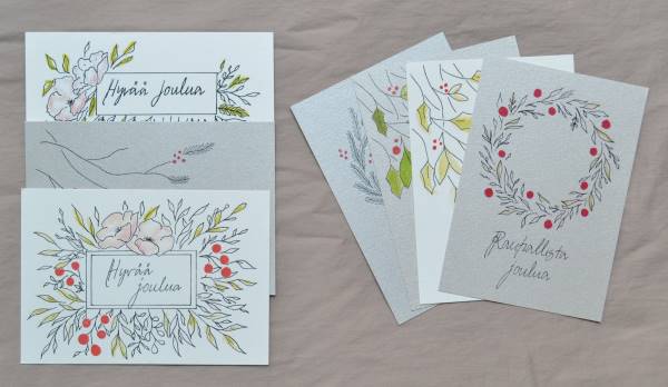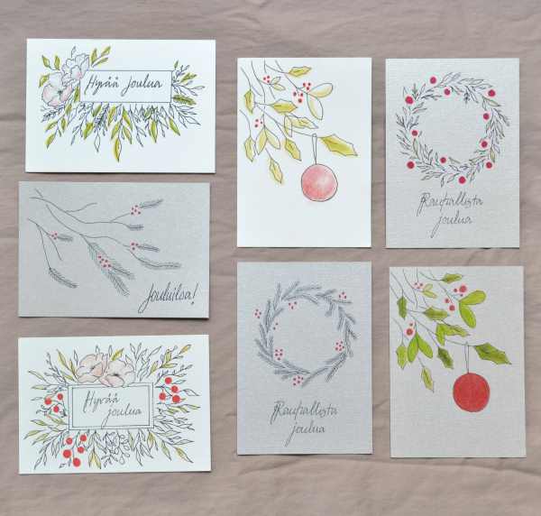 Ainutlaatuinen Saapu Designilla käsin piirretty kortti jouluun. Paketti sisältää 7 erilaista joulukorttia laadukkaalle valkoiselle tai hopealle helmiäispohjalle piirrettynä. Kortin koko 10cm*15cm.
