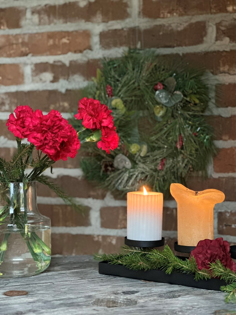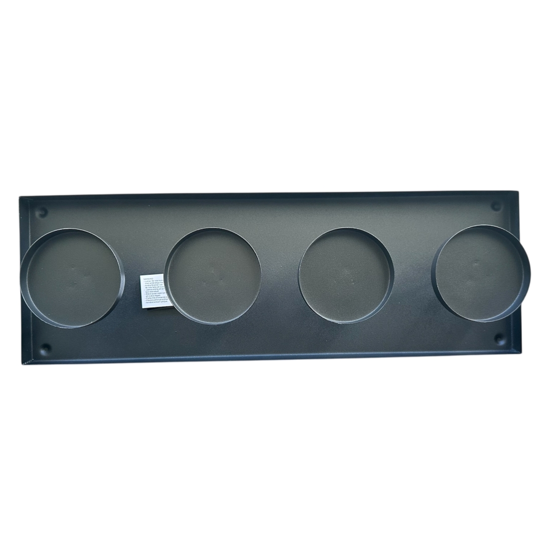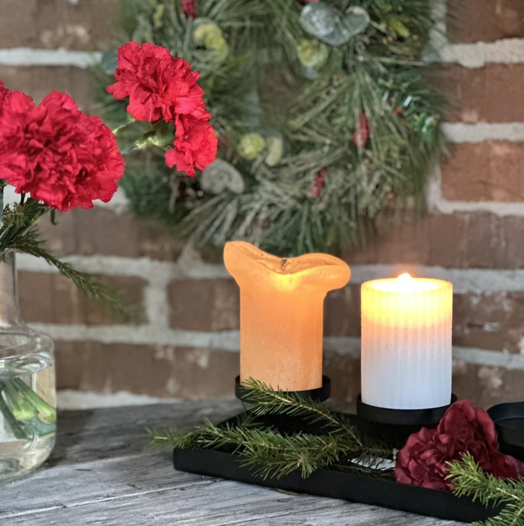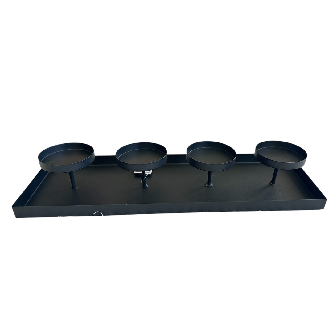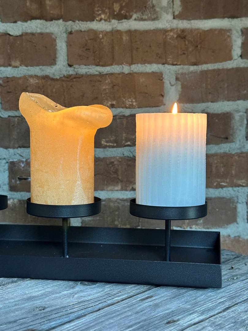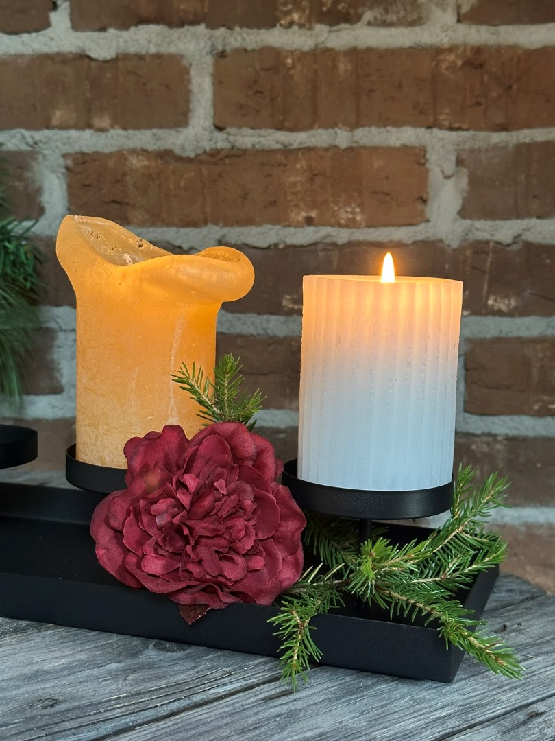 Tukeva musta suorakaiteenmuotoinen kynttiläteline on helppo koristella aluslautasen ansiosta. Aseta aluslautaselle erilaisia koristeita kuten havuja, käpyjä, marjoja tai joulukoristeita ja asetelma on valmis joka vuoden aikaan. Muista paloturvallisuus.