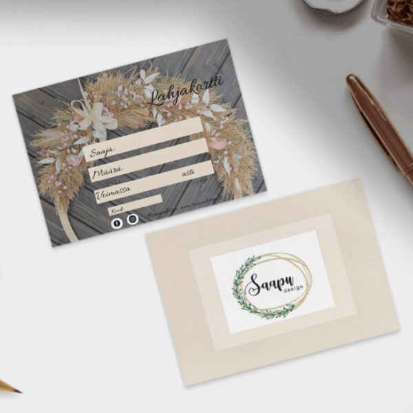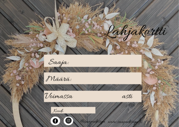 Yllätä ystävä, päivänsankari tai läheinen lahjakortilla. Ihana lahjaidea myös tupaantuliaisiin! Näin lahjansaaja voi itse rauhassa valita mieluisimmat tuotteet. Lahjakortti käy koko Saapu Design valikoimaan ja lahjakortti on voimassa 6kk ostopäivästä. Lahjakorttia ei vaihdeta rahaksi eikä lahjakortilla ole vaihto- ja palautusoikeutta.