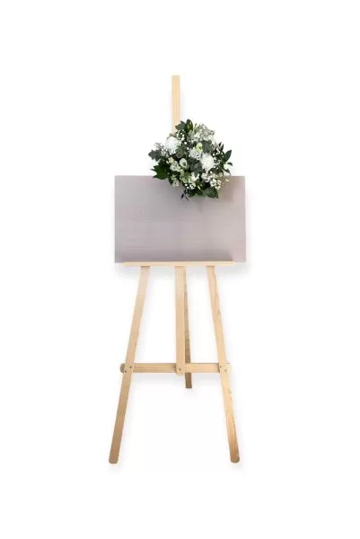 Säädettävä ja kokoontaitettava puinen maalausteline tervetuloa-kyltille, pöytäkartalle tai photo booth ohjeille.
