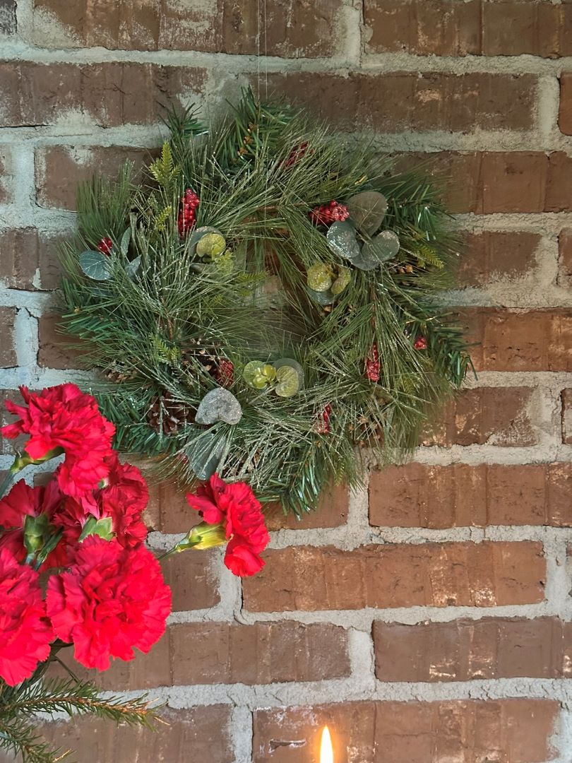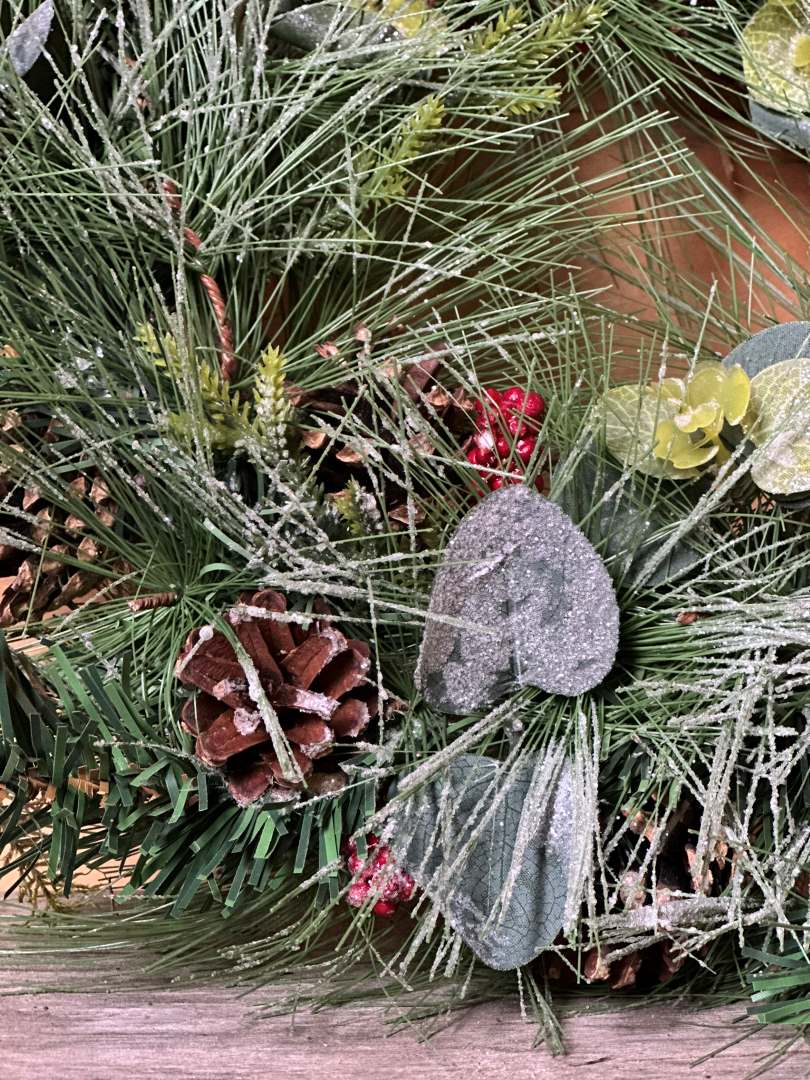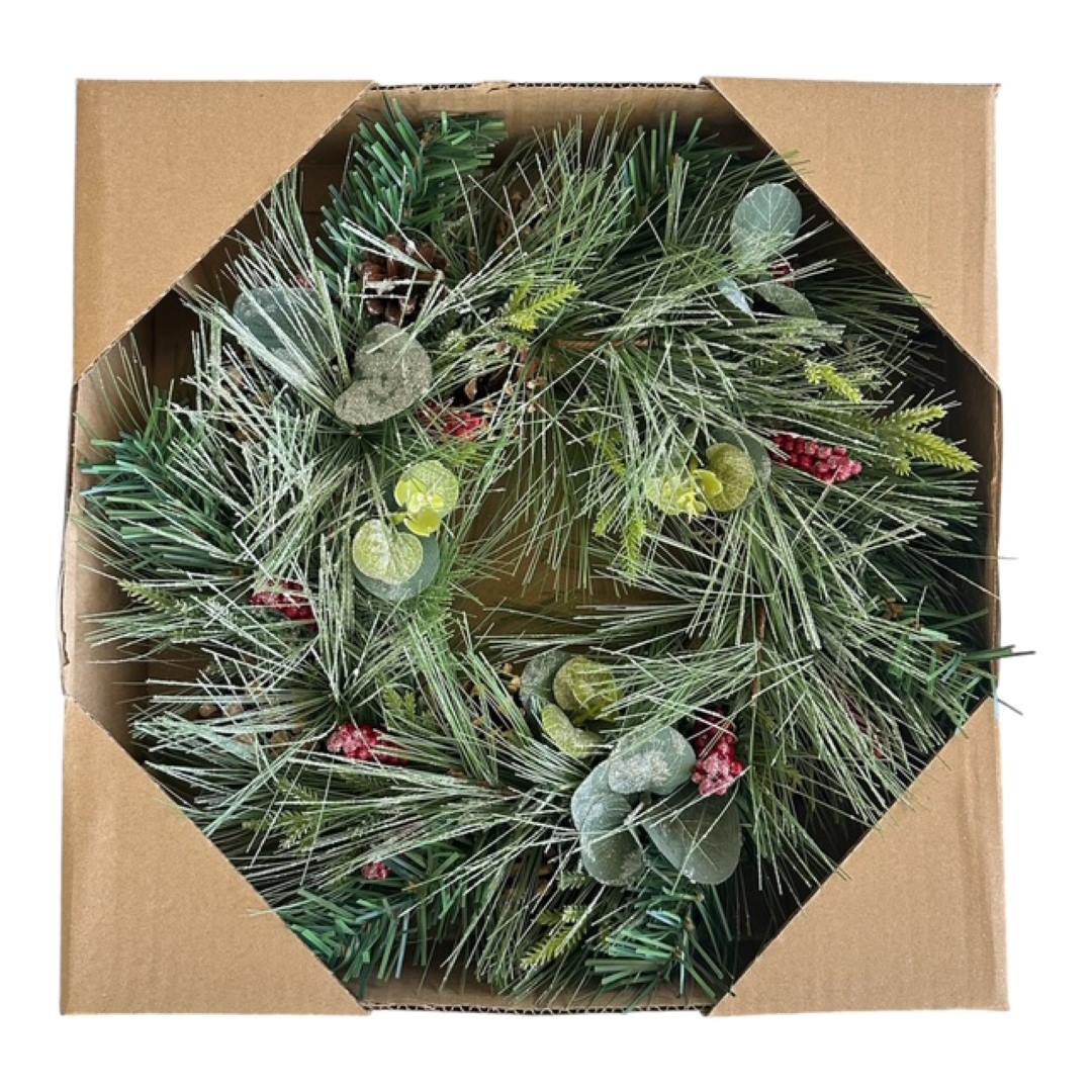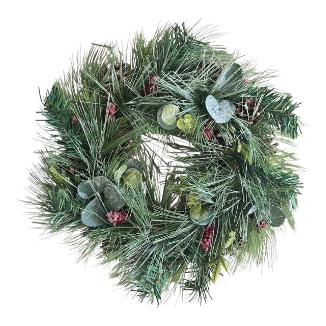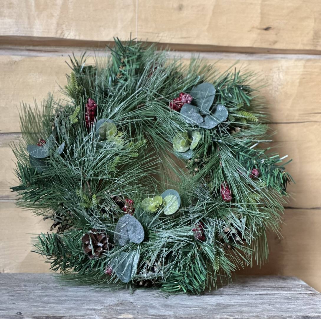 Koristeellinen kranssi punaisista marjoista, havuista ja eucalyptuksen lehdistä. Tämä kranssi on suunniteltu kestämään vuodesta toiseen- ilman neulasten varisemista tai marjojen kuihtumista. Sopii erinomaisesti oveen, seinälle tai pöydälle mutta myös allergiakoteihin! Kranssin halkaisija on 34cm.